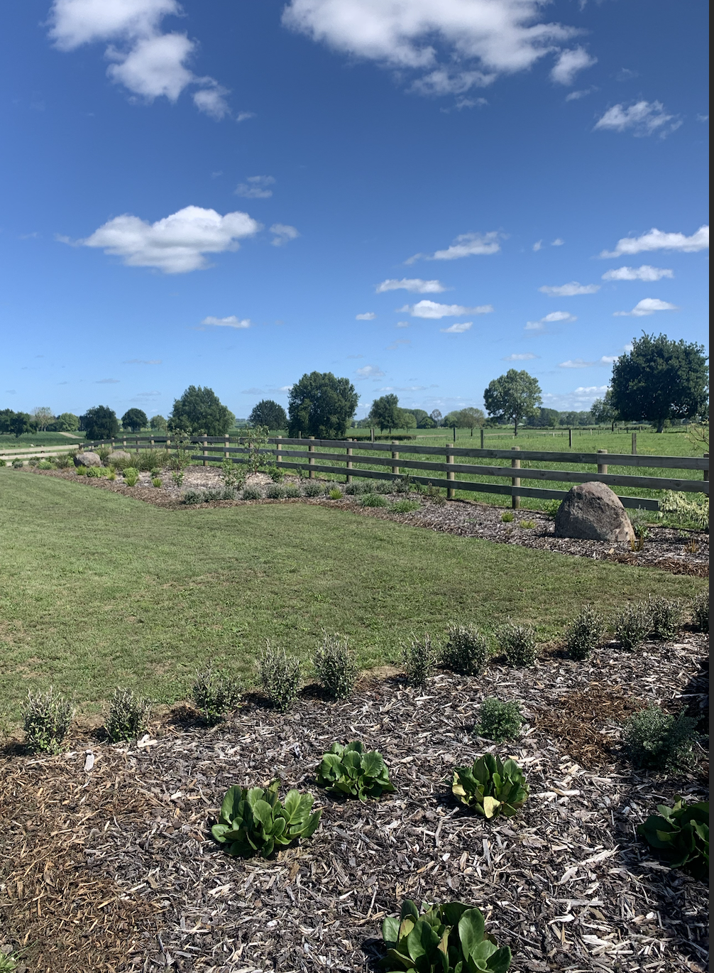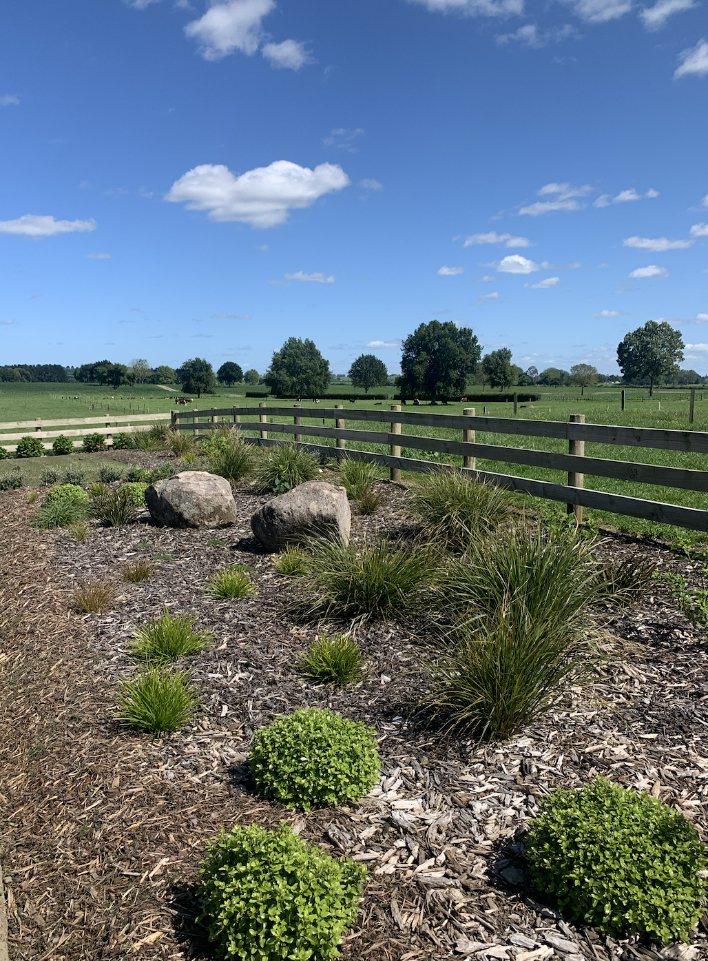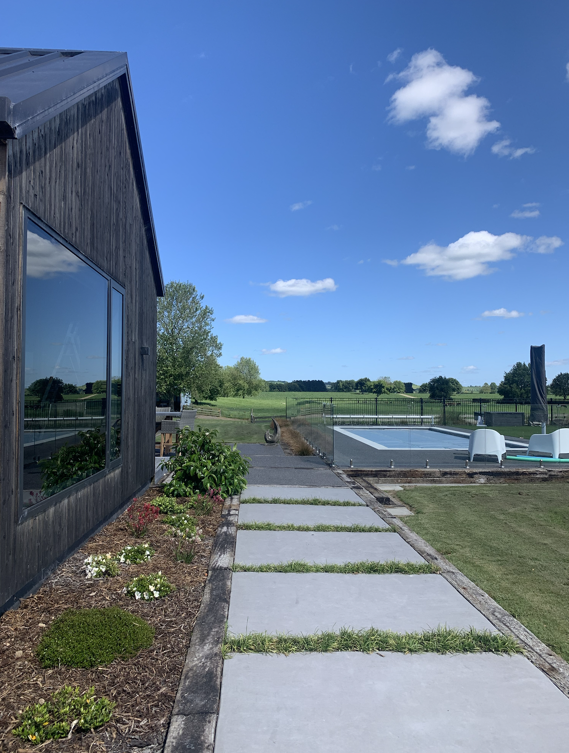 The design for this large rural property aimed to create manageable garden spaces while preserving the expansive views. We incorporated a cricket-pitch-sized lawn area and larger trees at the entry, primarily utilizing a native plant palette for the remainder of the garden areas.